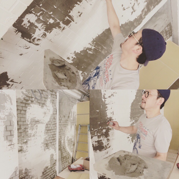 今日は壁を少しモルタルで汚す作業してみました 真似事ですが、すいません